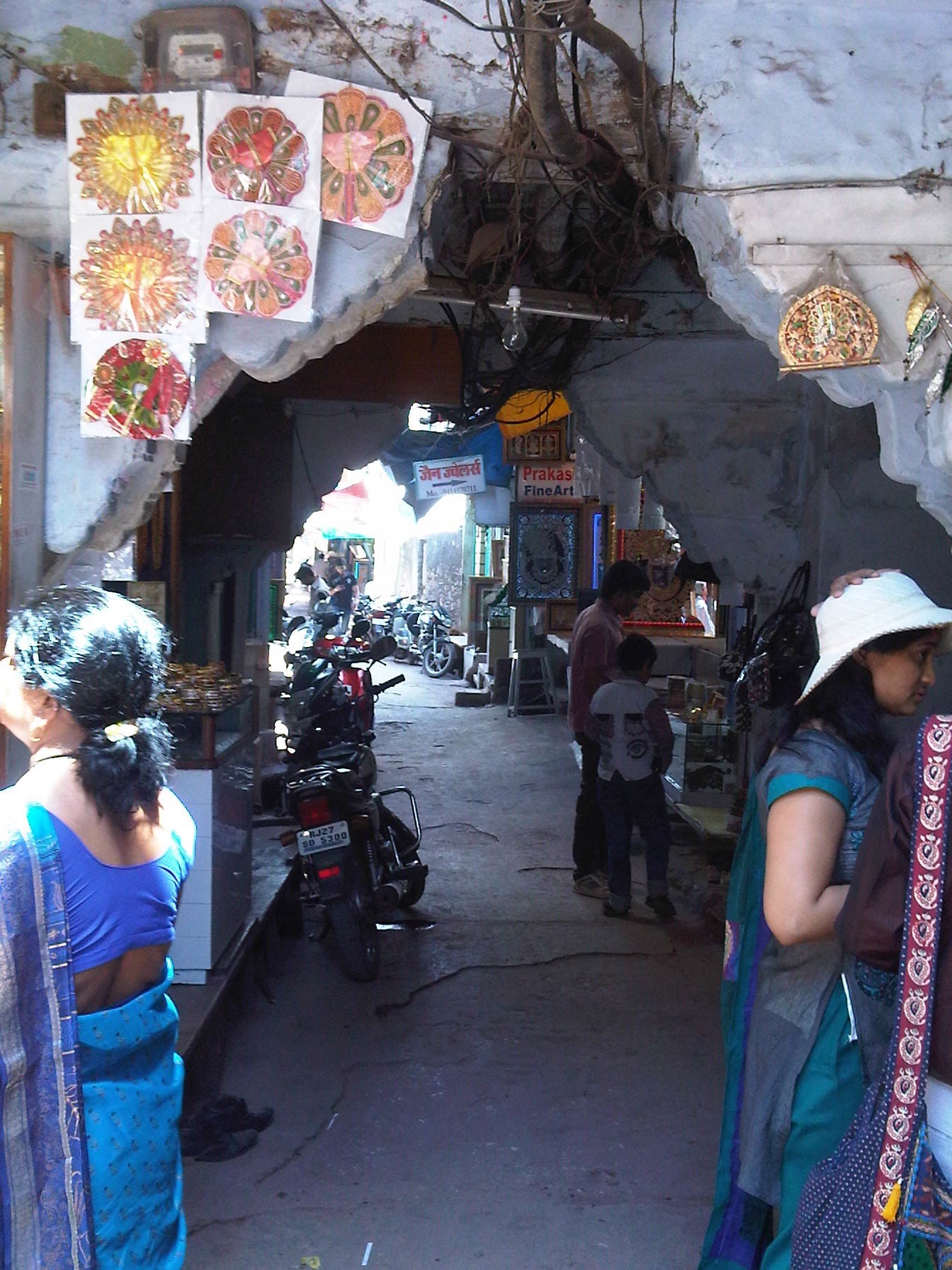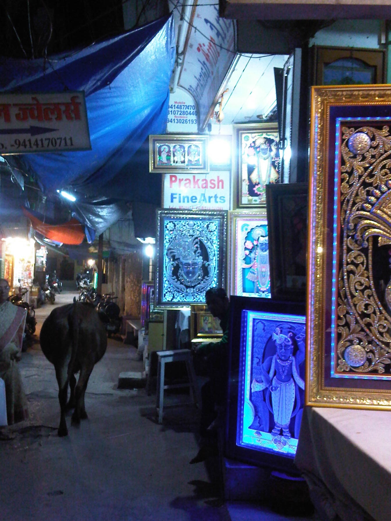 The lanes which converge into the Mandir marg are filled with small shops on both sides of the narrow lanes, selling their wares – from fabric to jewellery to sarees to srinathji frames to articles for pooja to grains to offer the god at the temple.